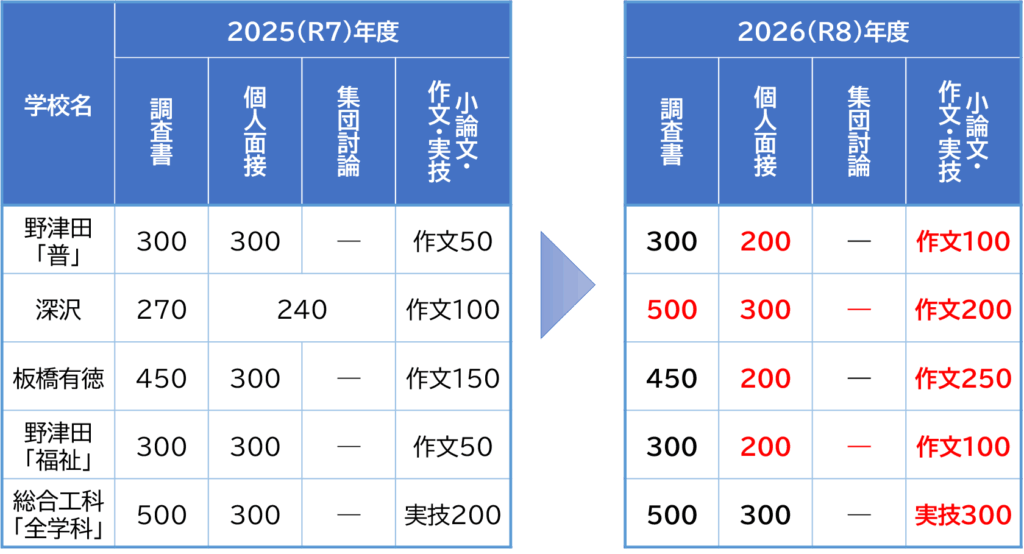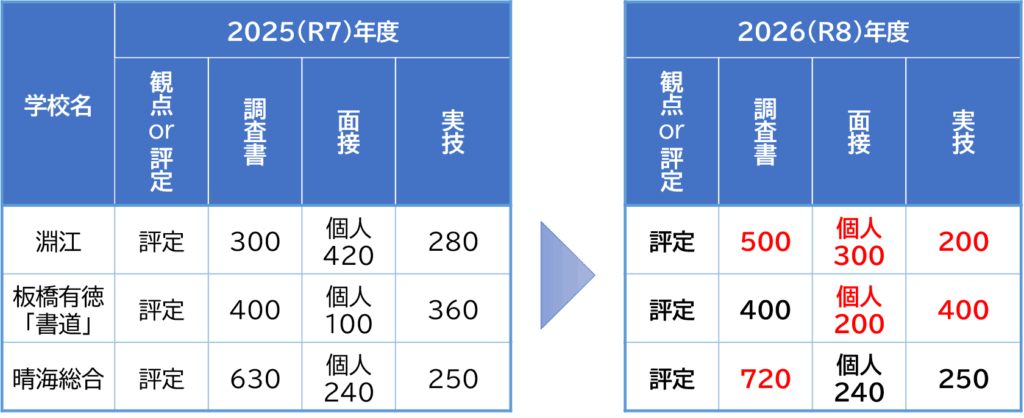 - 高島・・作文(100)廃止(配点は調査書200,集団面接300,実技300)