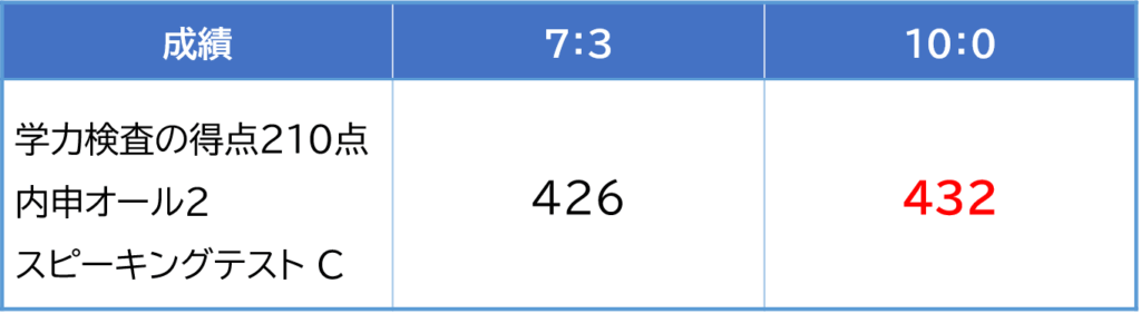 オール2の受検生で学力検査が210点、スピーキングテストの結果がCの場合は次のようになり、10:0で算出した総合得点が受検生の成績になります。