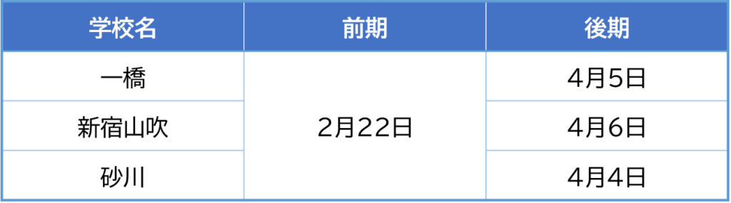 前期は2月22日、後期は学校によって異なり以下のようになります。