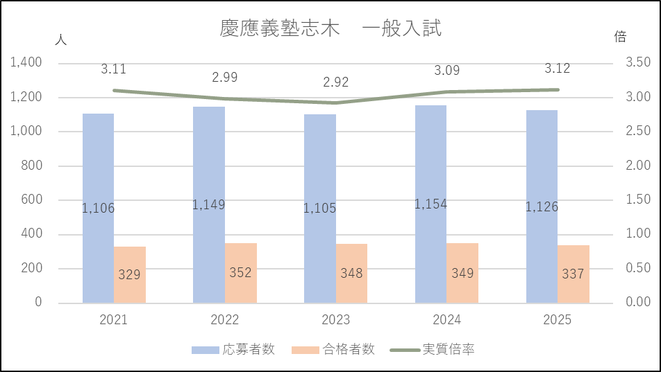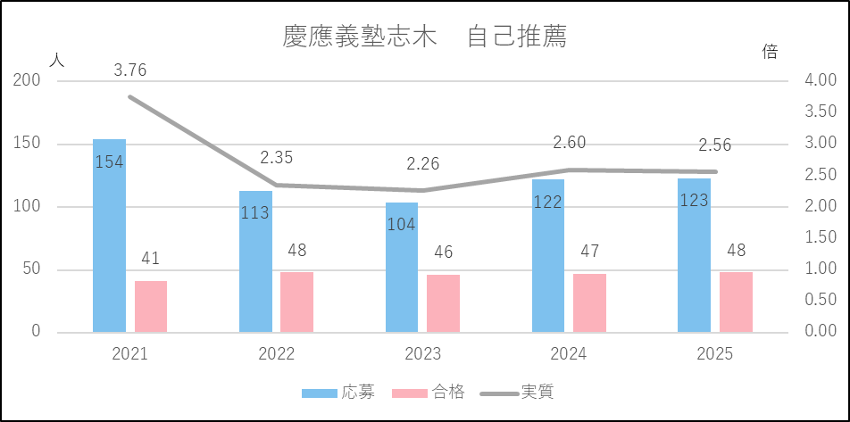 慶應義塾志木の一般入試の応募者数はこの5年間1,100人台で推移しており,実質倍率も3倍前後で安定しています。自己推薦もコロナ禍の2021年度に応募増(2020年度の応募者数104人)となり,実質倍率も2.60倍から4倍近い3.76倍に上がったものの,以降落ち着きを取り戻しています。ただ2022年度からは50人近い合格者を出すようになりました。2026年度入試ではその実態に合わせるためか,自己推薦の募集人員を40人から50人に増やし,一般と帰国募集を190人から180人に減らします。これにより一般入試の合格者が絞られると実質倍率が上がる可能性があります。