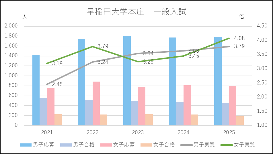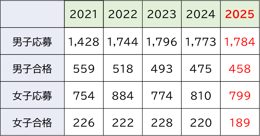 早稲田大学本庄の男子の応募者は2021年度にコロナ禍によって1,400人台に落ち込んだものの,翌2022年度から元の1,700人台に戻っています。一方女子は増減を繰り返しているような状況です。しかし,合格者数は男女とも減少傾向で実質倍率は上昇しており,2025年度は女子が4倍を超え,男子を上回る厳しい入試になりました。