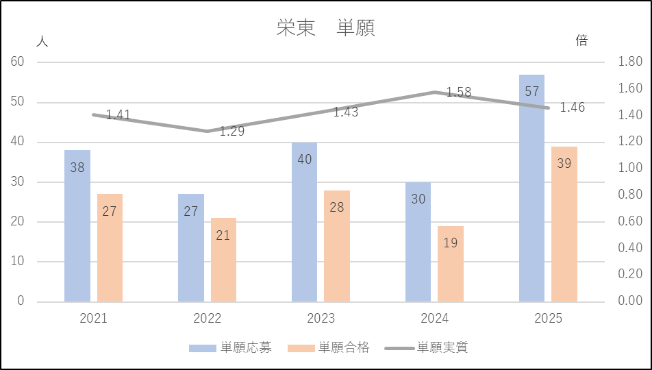 栄東の2025年度入試の特徴は単願の応募者が急増したことです。人数は57人ですが,併願者が圧倒的に多い本校で単願応募者が50人を超えたのはこの10年間ではありません。この結果,一般入試のフリー受験者の合格率に影響を与えたようです。