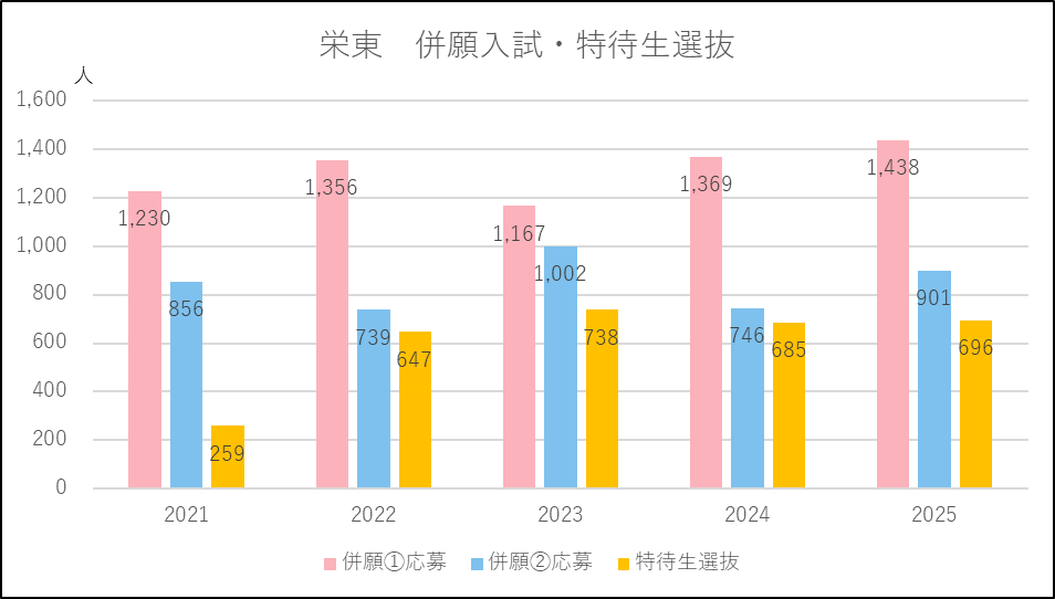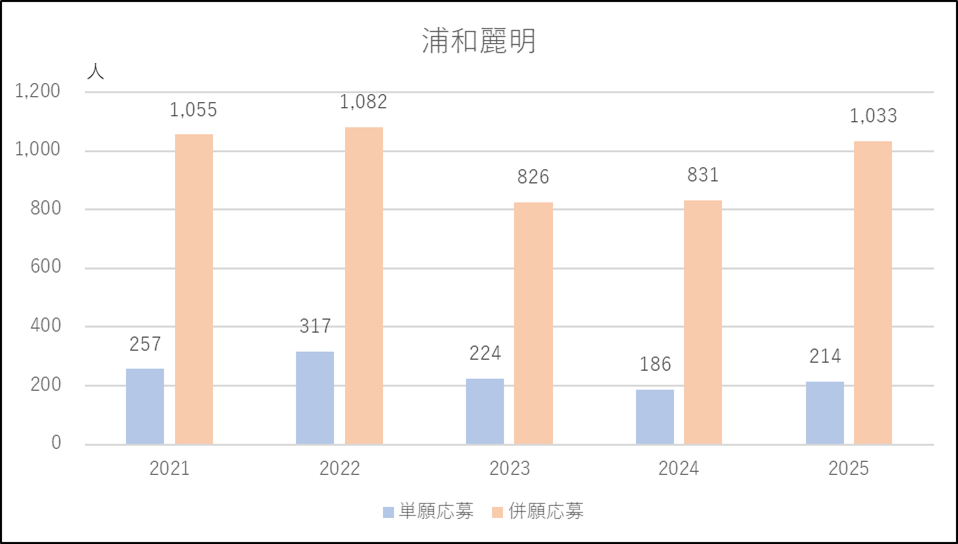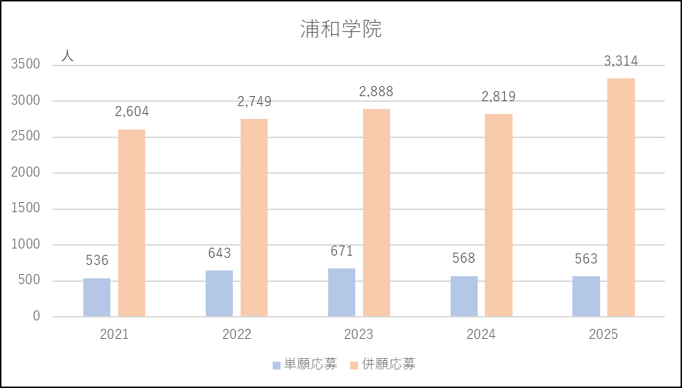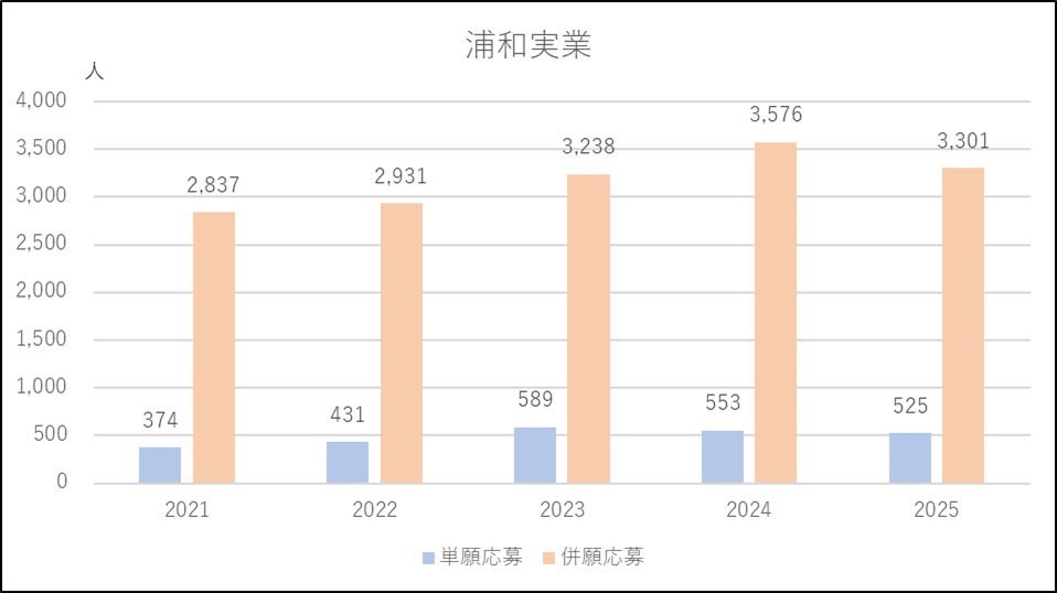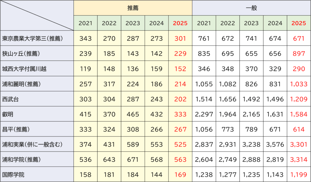 浦和学院の特徴は多くの学力レベルの異なるコースをもち,幅広い学力層の生徒を受け入れることのできる間口の広さがあります。出願基準の変更も少ないため安心して受験できるのもメリットになっています。2025年度に併願応募者が約600人増えたのは浦和実業と叡明のハードルが上がった影響と考えられ,3,000人を大幅に超える多くの受験生があつまりました。