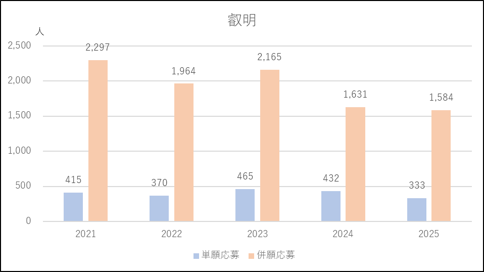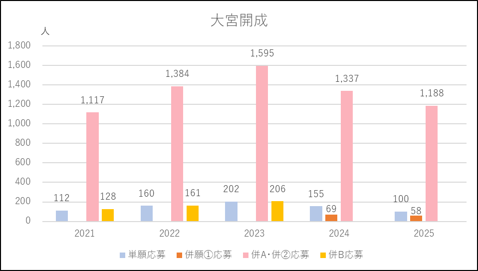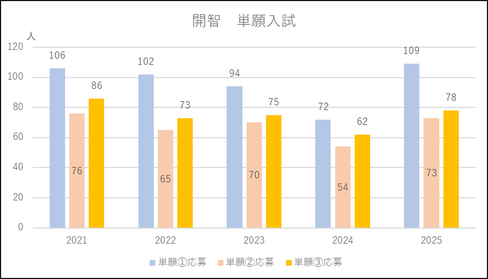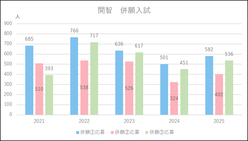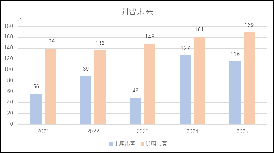 開智未来は2024年度に「開智クラス」の出願条件を緩和したことから単願を中心に応募増になりました。2025年度は逆に「開智クラス」の出願条件を厳しくし単願が微減となったものの併願は2024年度並みを維持しました。