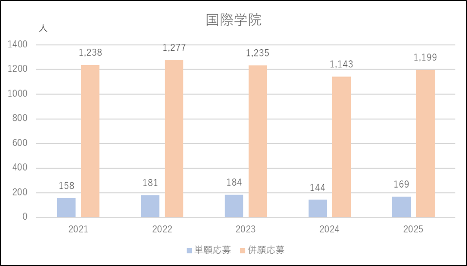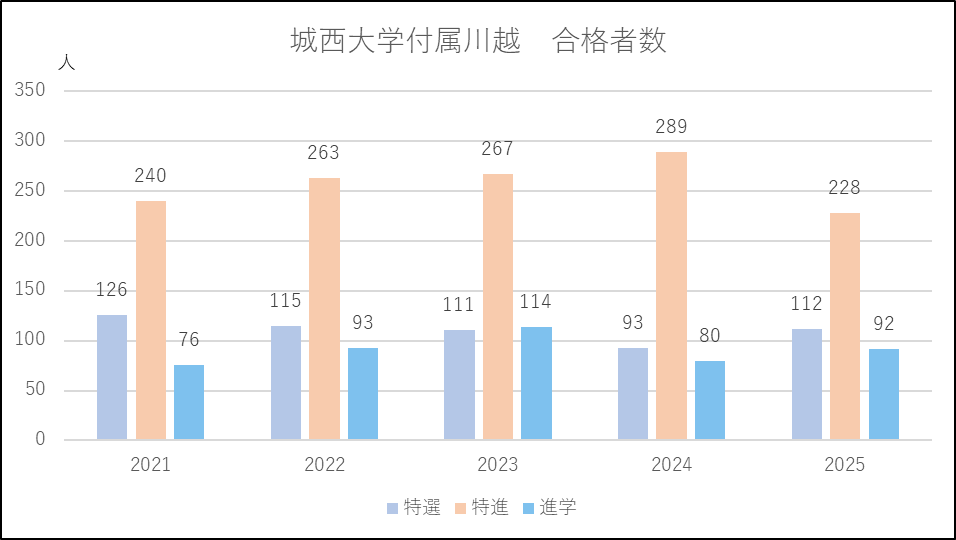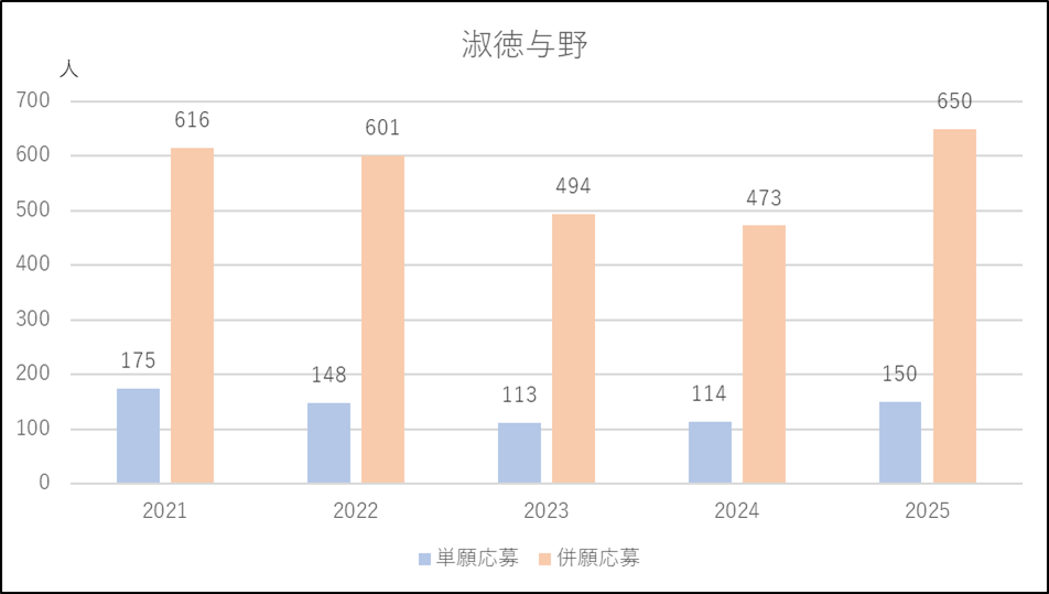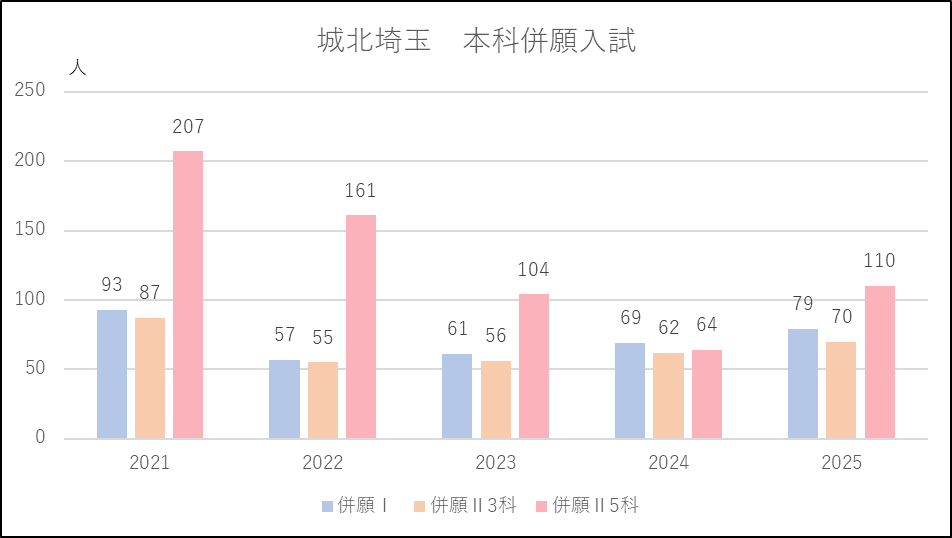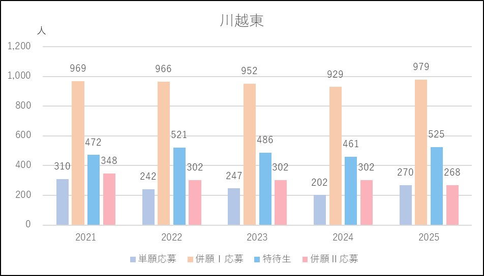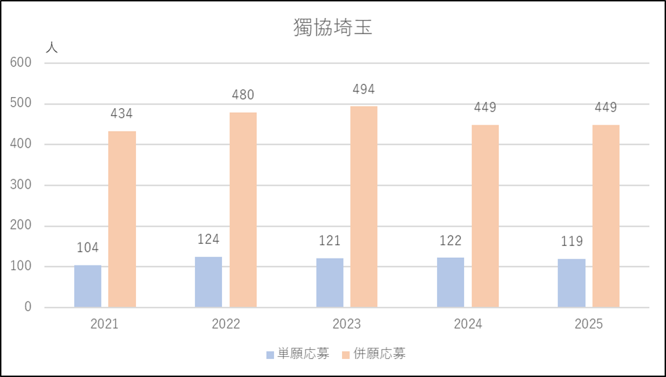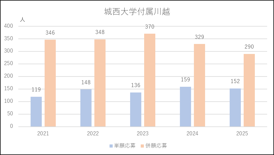 城西大学付属川越は特進コースの募集減が響いたのか,または城北埼玉に移動したのか,併願応募者が減少し,この5年間でもっとも少ない人数になりました。一方で単願は2024年度並みで多い人数を維持しています。