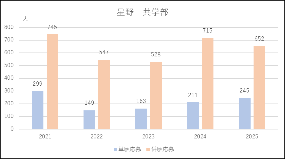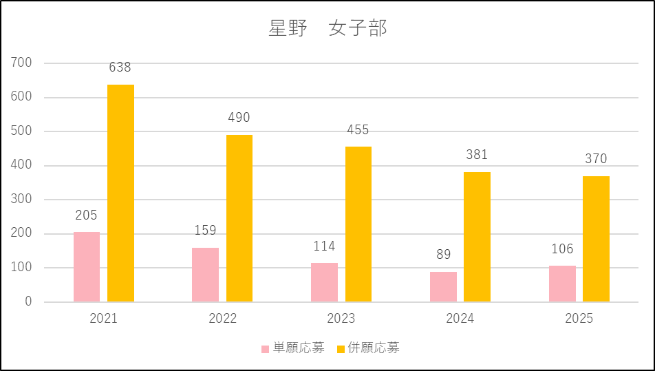 星野(共学部)は2024年度に出願条件を緩和したため単願,併願ともに応募増になりましたが,2025年度は単願は増えたものの,併願は微減になりました。近隣の山村学園も応募減になっていることから,西武学園文理に移動しているのかもしれません。
