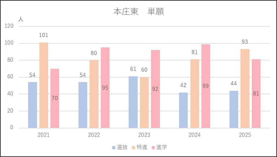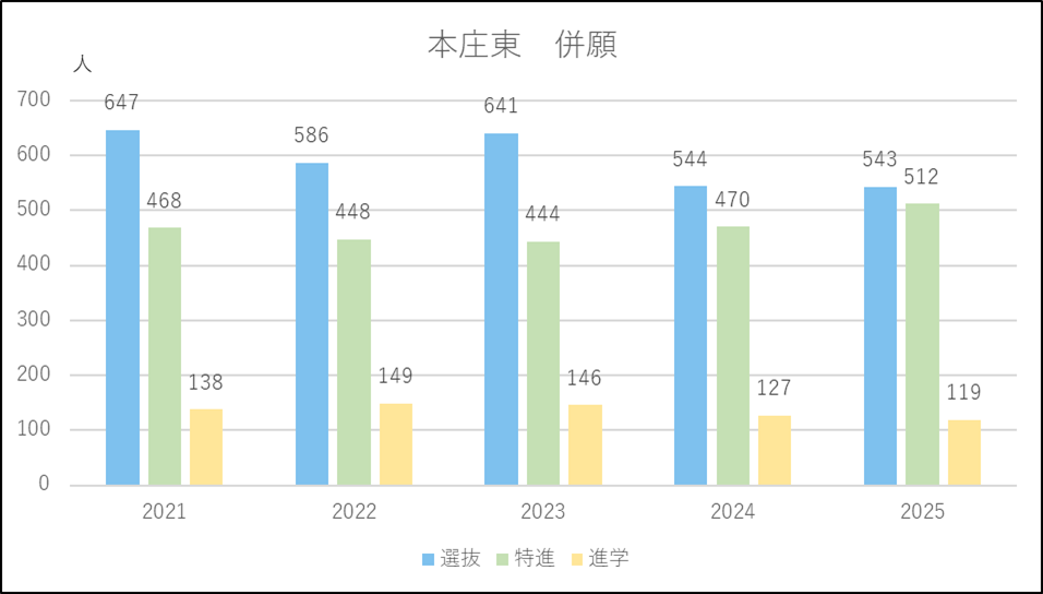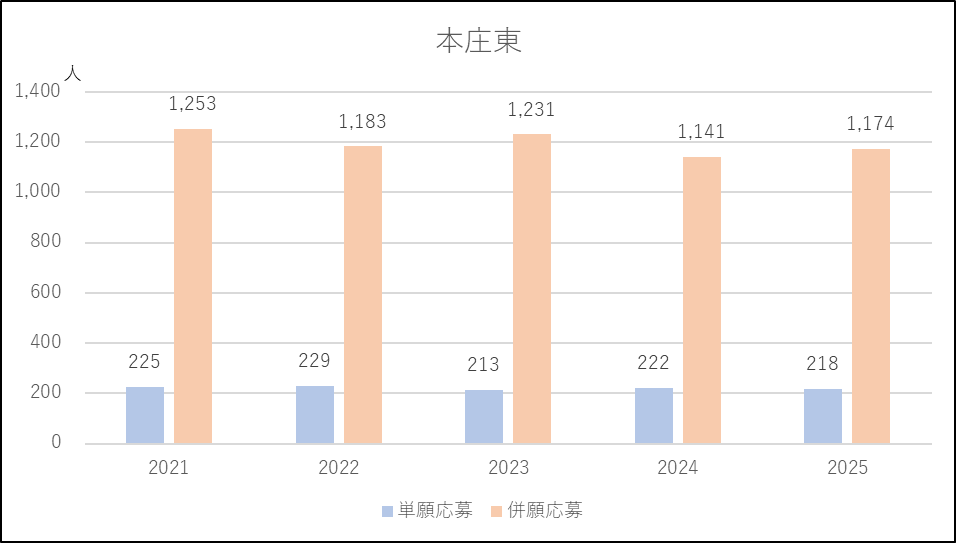 本庄東は併願応募者が小幅で増減を繰り返していますが大きな変動がなく推移しています。