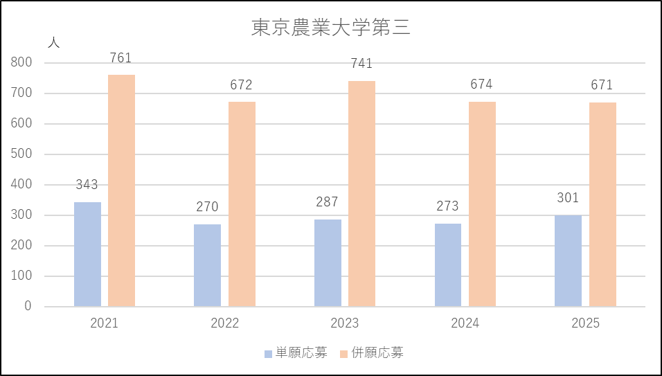 東京農業大学第三は単願の出願条件を利用しやすく変更したため応募増となり,4年ぶりに300人を超えました。一方,併願応募者はⅠコース,Ⅱコースとも2024年度並みでした。