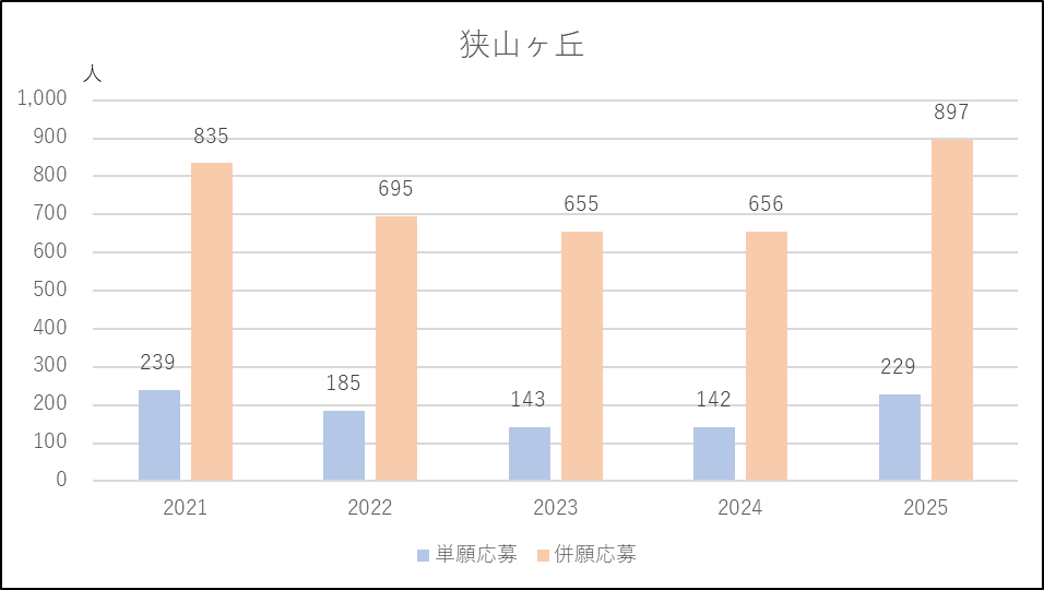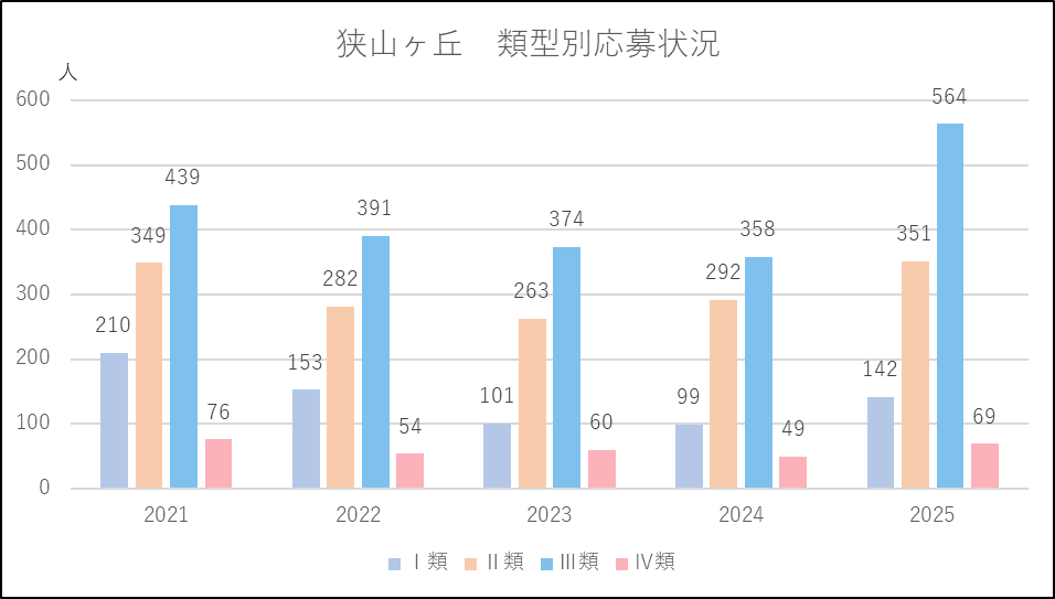 狭山ヶ丘は応募者が減少傾向でしたが,2025年度は出願条件を緩和したことから各類型で応募増となり,2021年度の水準に戻りました。類型別では比較的利用しやすいⅢ類の応募者が5割増となり突出しています。募集人員を減らし(400→300人)ましたが,入学者数は増加したようです。