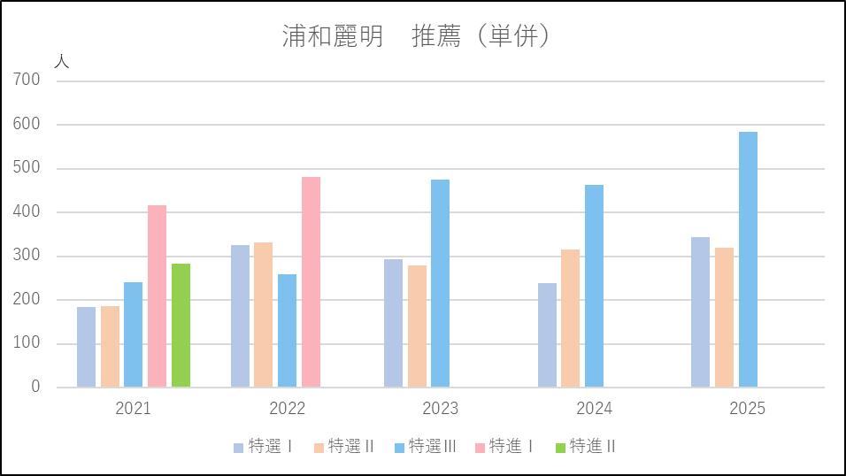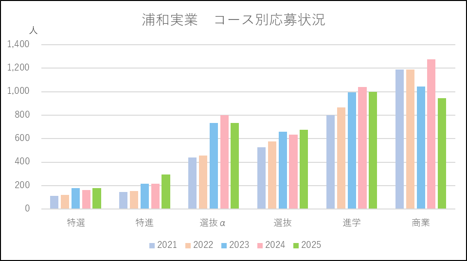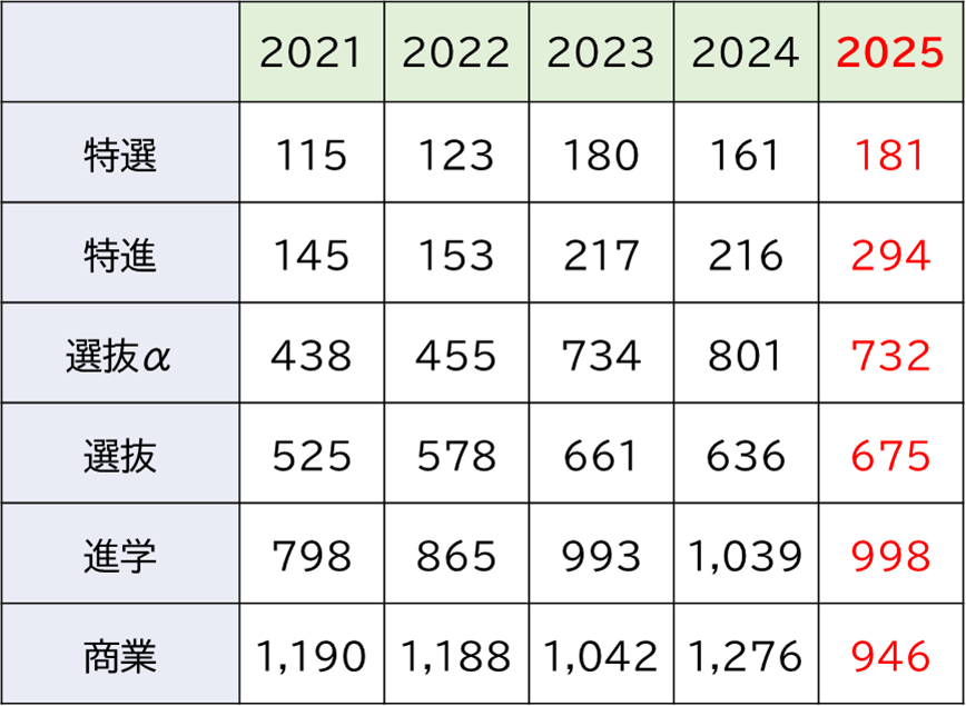 浦和実業は新校舎の建設・完成を機に2024年度,2025年度と出願条件を厳しくしています。ただ,2024年度は選抜αの併願や商業科の条件は変わらなかったため応募者が増加し,全体でも併願応募者が増加しました。グラフを見てもわかるように,各コースとも応募者は増加傾向になっています。2025年度は特進選抜と特進の併願以外で厳しくなったため,進学と商業科を中心に応募者は減少したもののこれら上位コースの応募者は増加しました。このような変更によって少しずつ上位層が厚くなってきているようです。
