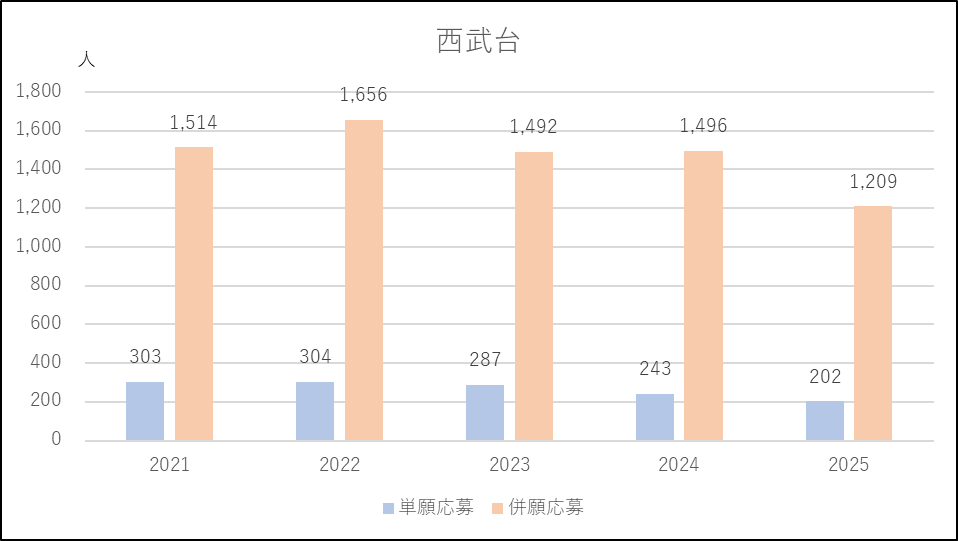 西武台の応募者は単願,併願ともに減少傾向になっています。2023年度はSTEAMコースを新設し,募集の核となる選抜Ⅱの募集人員を減らしたことから応募減,2025年度は狭山ヶ丘が出願条件を緩和し応募増になっているので,その影響を受けたと考えられます。