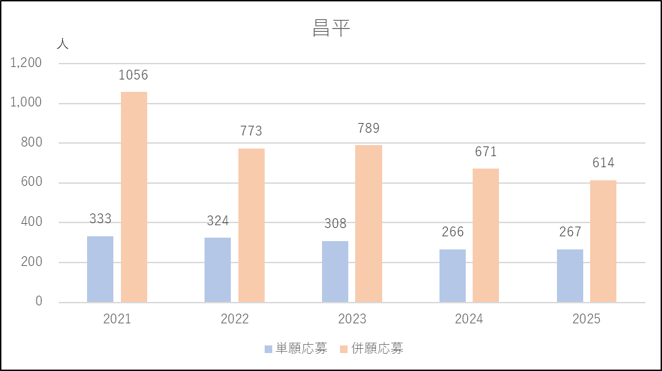 昌平は出願条件の変更が多く,厳しくなったり緩和されたり安定していません。2023年度,2024年度と連続して上がり,単願を中心に応募減が続きました。2025年度は一転して緩和になったものの,単願,併願とも応募増には結び付きませんでした。