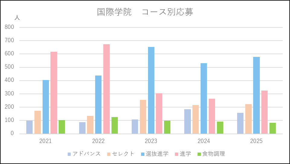 国際学院は選抜進学と進学で併願のハードルが上がりましたが,花咲徳栄からの移動があったのか,両コースとも応募増になりました。総合学科に属する選抜進学と進学は2023年度を境に応募状況が変化し,応募者の中心が進学から選抜進学にシフトしました。以降,選抜進学がメインのコースになっています。