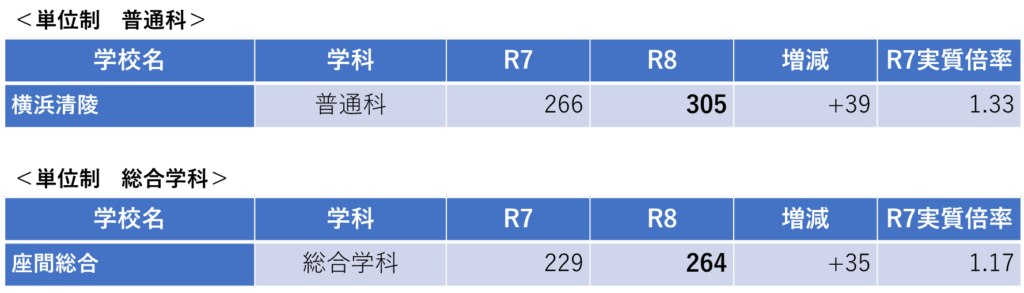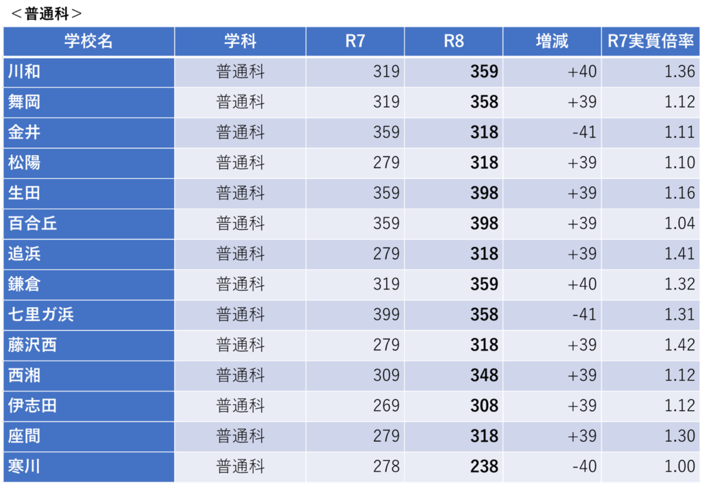 川和は3年ぶりの学級増です。前回のR5年度のときは志願者数の増減がなく,募集増の分倍率が下がり過去最も緩やかな入試(実質倍率1.16倍)になりました。来春の入試では地元都筑区をはじめ緑区や青葉区の生徒数が減少していることや,今春,志願者が大幅に増加(志願確定者数399→449人)したことから志願者減になる可能性が高く,高倍率にはなりにくい状況にあります。