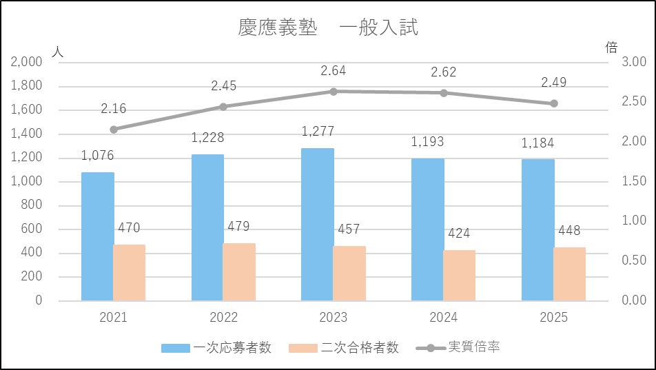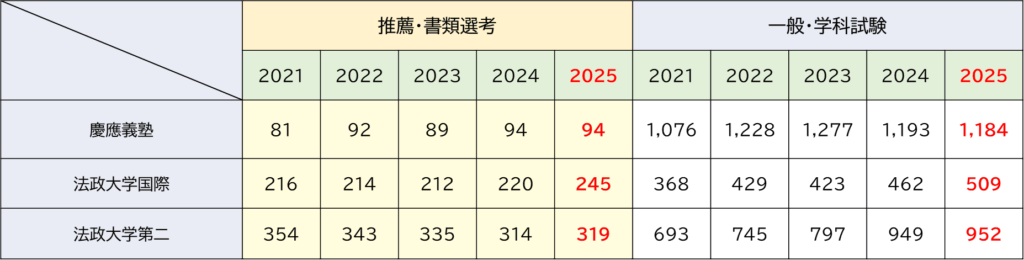 慶應義塾の一般入試の応募者数は前年度並みだったものの,合格者が増加し実質倍率はややダウンしています。しかしいまだ2.5倍前後の高倍率で厳しい入試状況が続いているといえるでしょう。