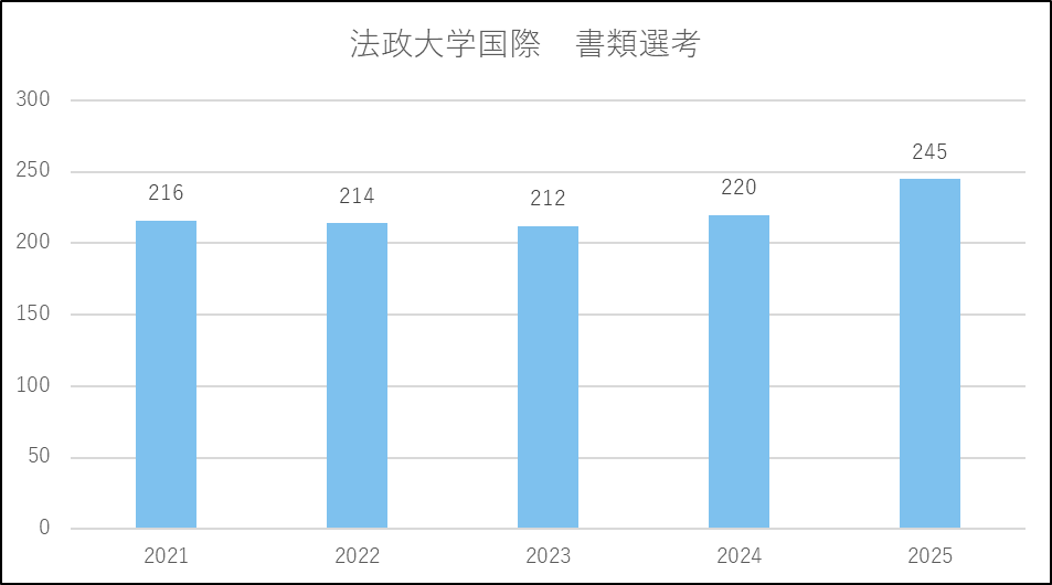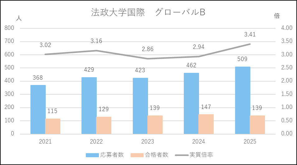 法政大学国際は書類選考,グローバルB(学科試験)ともに応募者は増加傾向です。グローバルBでは増加していた合格者をやや減らしたことから実質倍率が上がり,最近の5年間で最も高い倍率になりました。