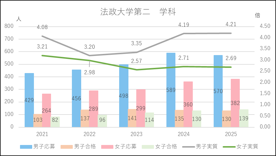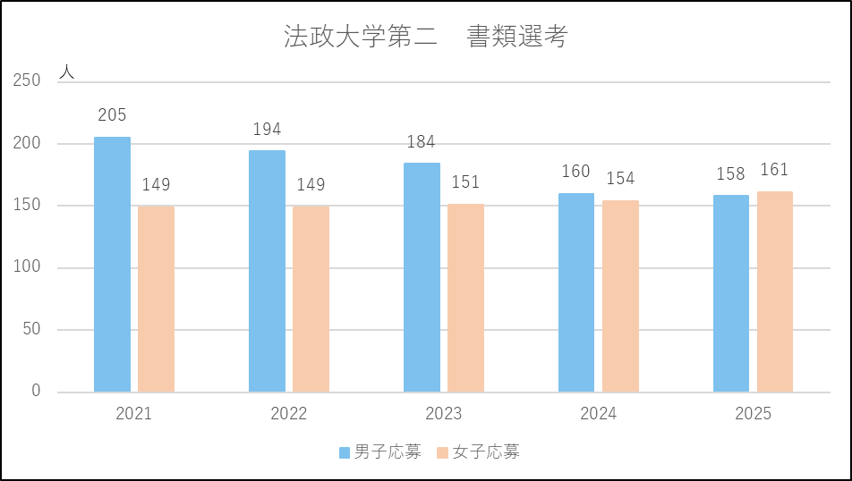 法政大学第二の一般入試(学科)では,応募者数の推移に男女差が見られました。