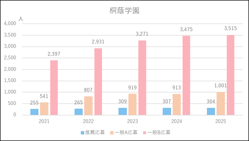 2025年度の桐蔭学園の一般入試の応募者数は,学校全体で4,516人になりました。前年度までの急激な増加(2,938→3,738→4,190→4,388→4,516人)は落ち着きを見せ,前年度より128人の増加に留まっています。