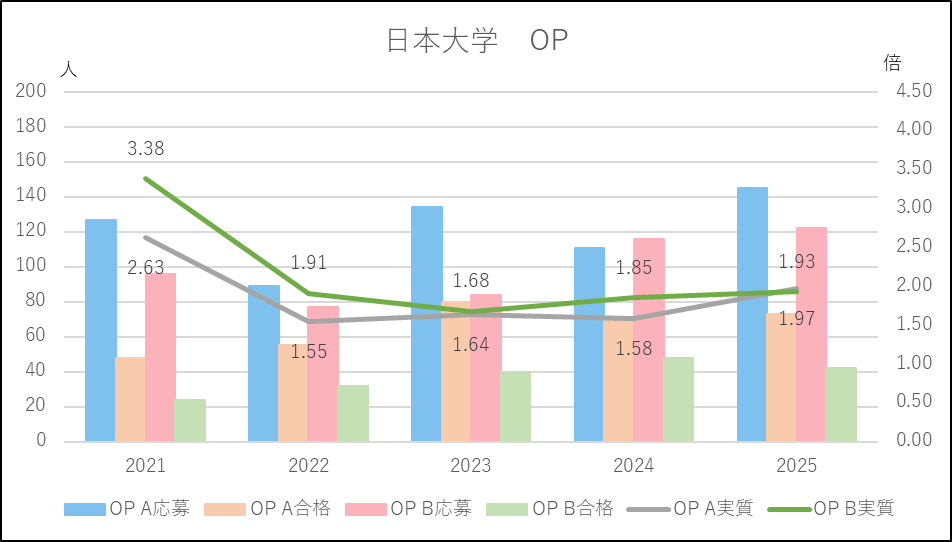 そのOP入試は2021年度に激戦になったものの,翌2021年度にはABとも下がり以降1.5~2倍の間で落ち着いています。ただ今春はABとも応募者が増加し実質倍率も上がりました。
