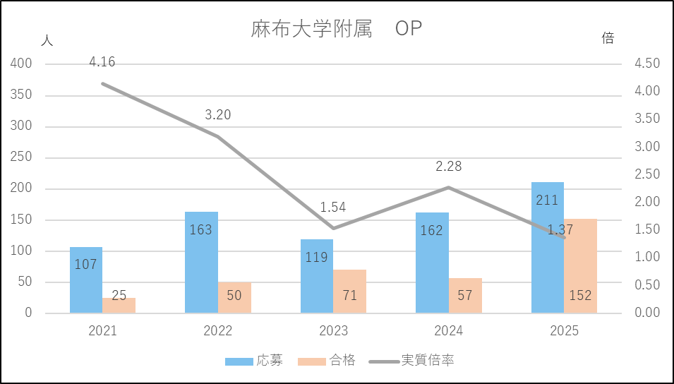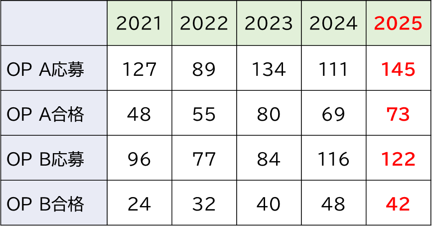 また,OP入試の受験者数も増加傾向(2021年度104人→2025年度208人)にあり,チャレンジ精神のある受験生にも人気があることがうかがえます。2025年度のOP入試は実質倍率1.37倍と不合格者も出ましたが,合格者数は例年(50~70人)より多い152人となり,実質倍率が1.3倍台に下がりました。