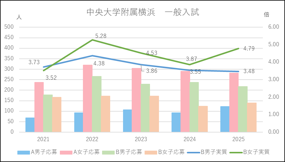 中央大学附属横浜は,2022年度に応募者数が増加,850人を記録しています。これは,青稜がコロナ禍対応で実施していた書類選考を学科試験戻した影響と考えられます。それ以降は反動で減少傾向にあり,2025年度も書類選考の定員を5人増加しましたが,応募者数は19人増に留まりました。