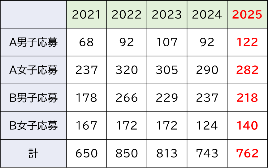 A方式(書類選考)では例年女子の応募が圧倒的に多いものの,2025年度は男子が30人増加し,女子は微減になりました。
