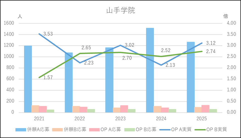 横浜創英は近年,大きな入試改革を進めており,応募状況が大きく変動しています。2022年度は2021年度に厳しくした出願条件を戻して大幅増,2024年度は併願入試を廃止し,一般入試をOP入試のみとしたことで応募者は激減しました。この入試形態は今後も継続される見込みです。