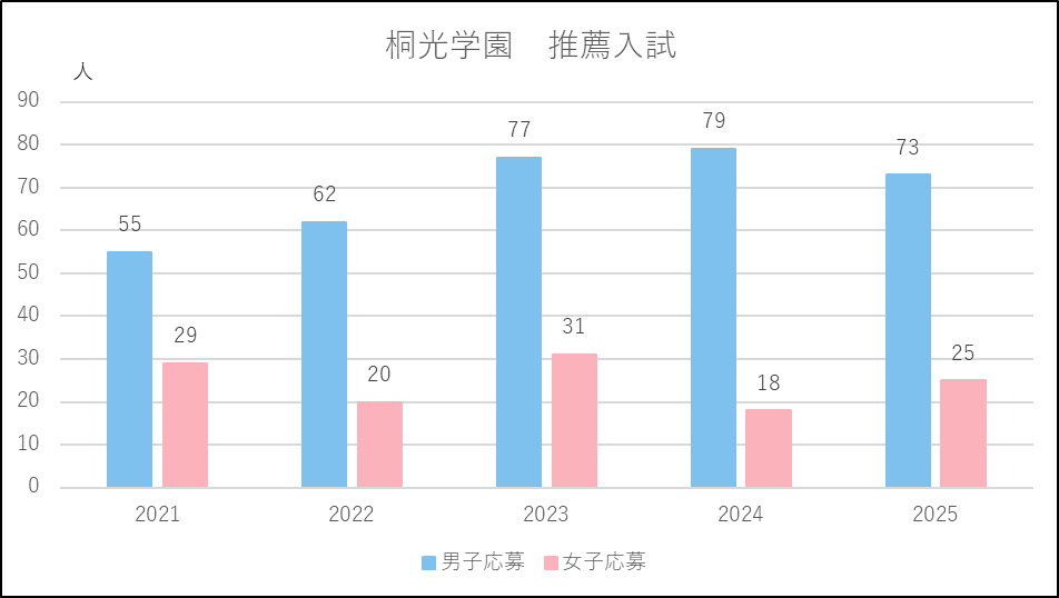 桐光学園は男女別学の学校です。募集人員は男子の方が多く設定されており,そのため推薦,一般入試とも男子の応募者が多く,男子中心の入試といえるでしょう。