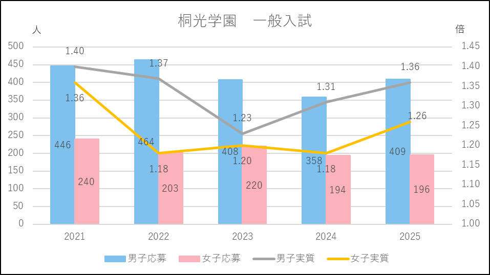 一般入試では,男子の応募者数が51人増(+14%)で409人,女子は前年度とほぼ変わらず196人でした。男子は合格者数も26人増加(+11%)したため,応募増の割に実質倍率の大きな上昇は抑えられました。一方で女子は合格者数が8人減ったことから,実質倍率が1.2倍台後半まで上がっています。しかし実質倍率の男女の差は変わらず,男子に厳しい入試が続きました。
