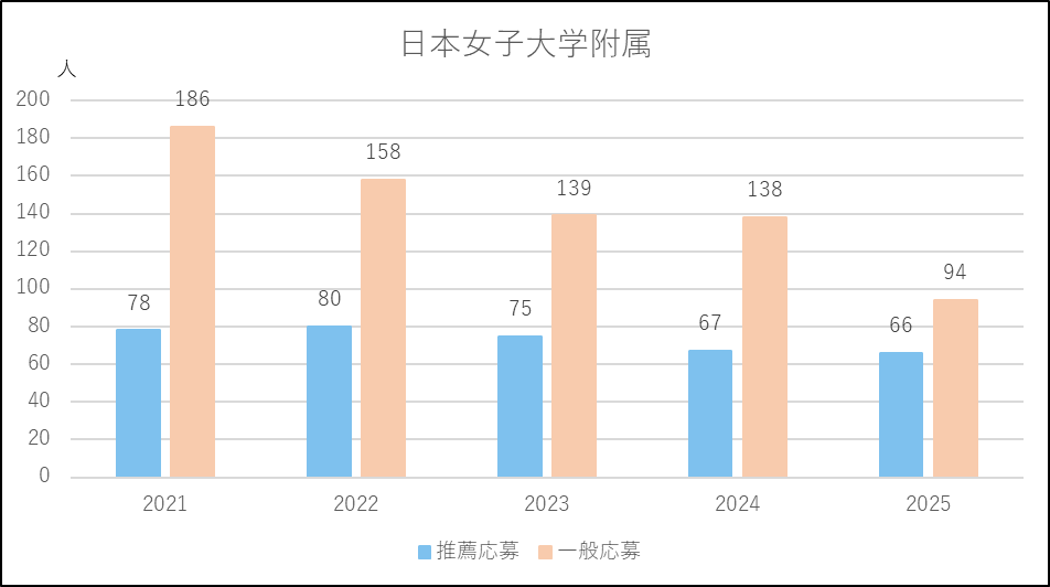 日本女子大学附属では,2021年度入試で一般入試に専願入試を導入し,第一志望者を優遇したことで志願者が増加しましたが,以降は減少傾向にあります。