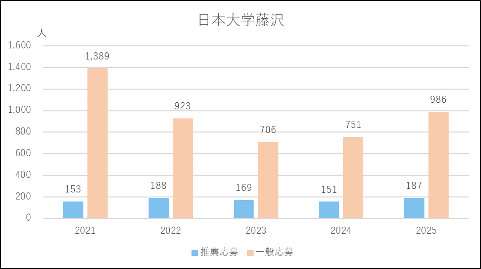 日本大学藤沢は,2021年度に推薦入試と一般入試で書類選考を導入。それにより,応募者数が1000人を超えました。翌年,書類選考を取りやめたことで一般の応募者は激減,推薦も2023年度から減少傾向にありました。