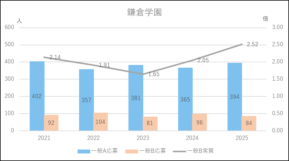 鎌倉学園では,一般A方式(書類選考)の応募者が29人増の394人となった一方で,一般B方式(筆記)は12人減の84人になりました。