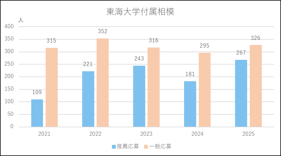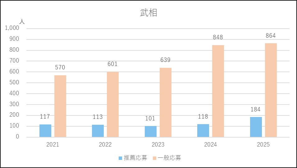 そして2025年度も加点上限の縮小などで出願条件を厳しくした結果,今春はついに応募者数が減少に転じました。推薦で79人減,一般で596人減となっており,出願基準の緩和し応募者数が増加した横浜清風に受験生が移動したと考えられます。