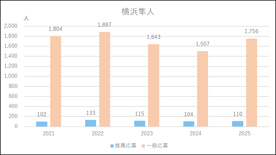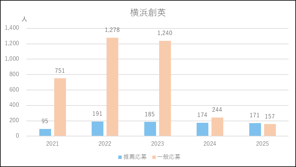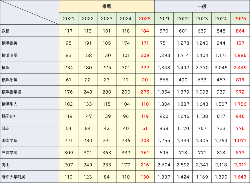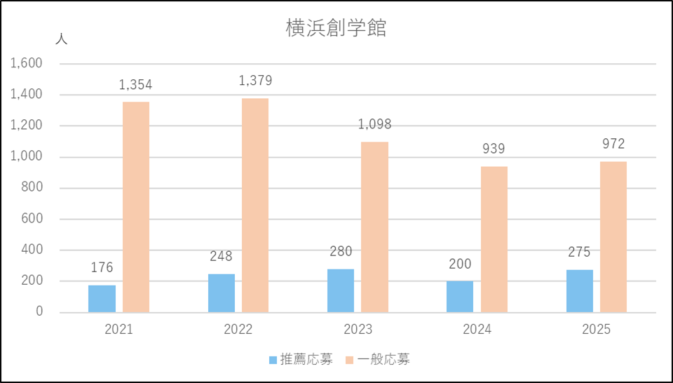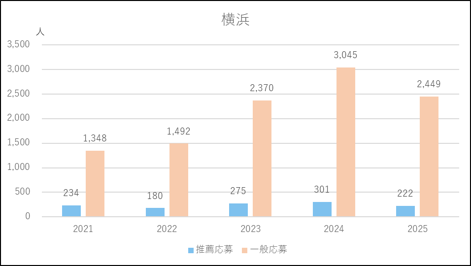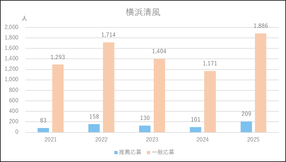 横浜清風は,2021年度に書類選考を導入し応募者が増加しましたが,2023年度から2024年度にかけて出願条件を厳しくしたことで減少傾向にありました。しかし2025年度は,推薦・一般ともに出願基準の緩和と加点の上限を拡大しての募集となり,その結果,一般・推薦ともに過去5年間で最多の応募者数を記録しました。2026年度は緩和した出願条件を元に戻すので,推薦・一般入試ともに応募者は絞られる見込みです。