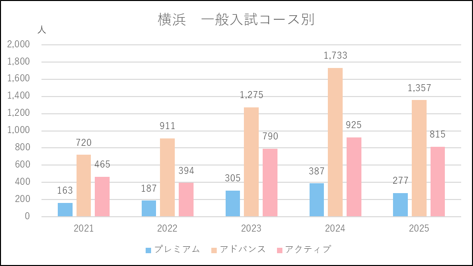 コース別では,『プレミアム』が前年度比110人減(-28.4%),『アドバンス』が376人減(-21.7%),『アクティブ』が110人減(-11.9%)となりました。アクティブは他2コースより合格ハードルを厳しく設定していたものの,減少値は最も低くなっており,人気の高さがうかがえます。