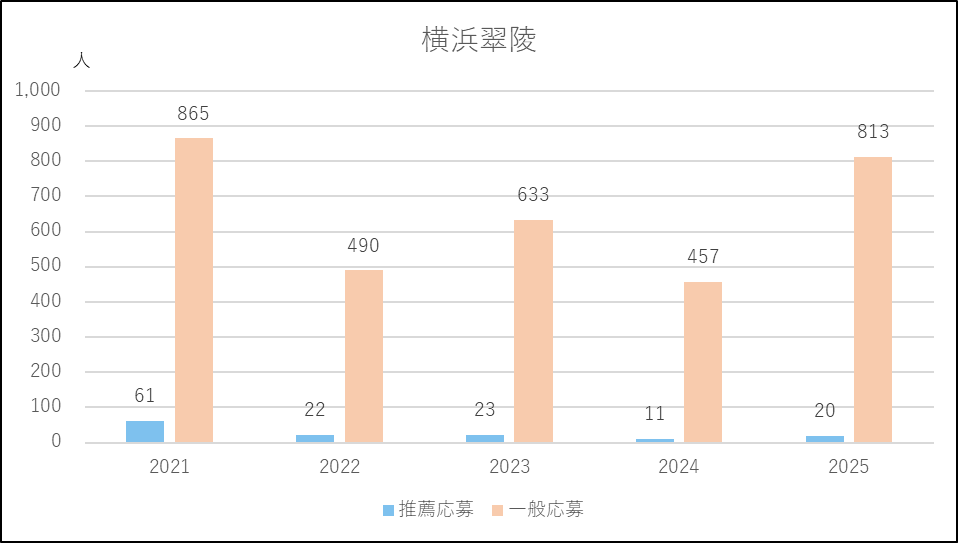 これを受け,2025年度には書類選考を復活させ,専願入試も導入,合格のハードルを下げました。これらの変更によって応募者数が249人増加しています。しかし,初めて書類選考を導入した2021年度の応募数には届きませんでした。これは,競合する横浜翠陵も2025年度より新たに書類選考を導入し,さらに基準も緩和したことで受験生が流れたためと考えられます。