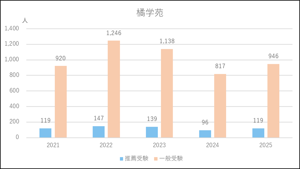 橘学苑は,2022年度は就学支援金の拡大による私立志向の影響で受験者数が増加しましたが,その後は国際コースの募集停止(2023年度),中学募集停止,および併願の出願基準が厳しく(2024年度)なったことで,受験者数は減少傾向にありました。