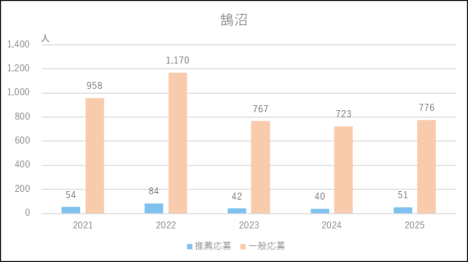 鵠沼は,2021年度から一般入試で書類選考を実施した結果,2022年度の応募者が1,170人にまで上りました。しかし,2023年度に推薦と併願の出願基準をアップしたことで応募者数が大幅に減少し,2024年度に基準を緩和したものの,専願に筆記試験を導入したことも影響してか,日本大学藤沢などへ受験生が流れたと考えられ,応募者数は減少しています。