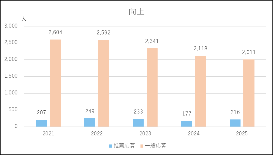 向上は,2021年度に一般入試を書類選考に統一し,出願基準を緩和したことで応募者数が約2,600人に上りました。