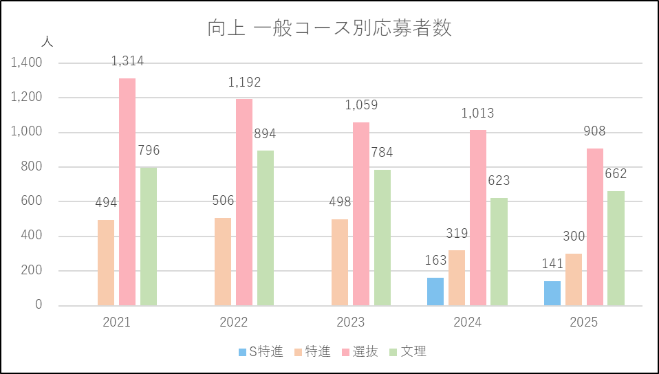 2025年度は文理が基準を緩和したため応募増になったものの変化なかった特進や選抜は減少傾向から抜け出せませんでした。