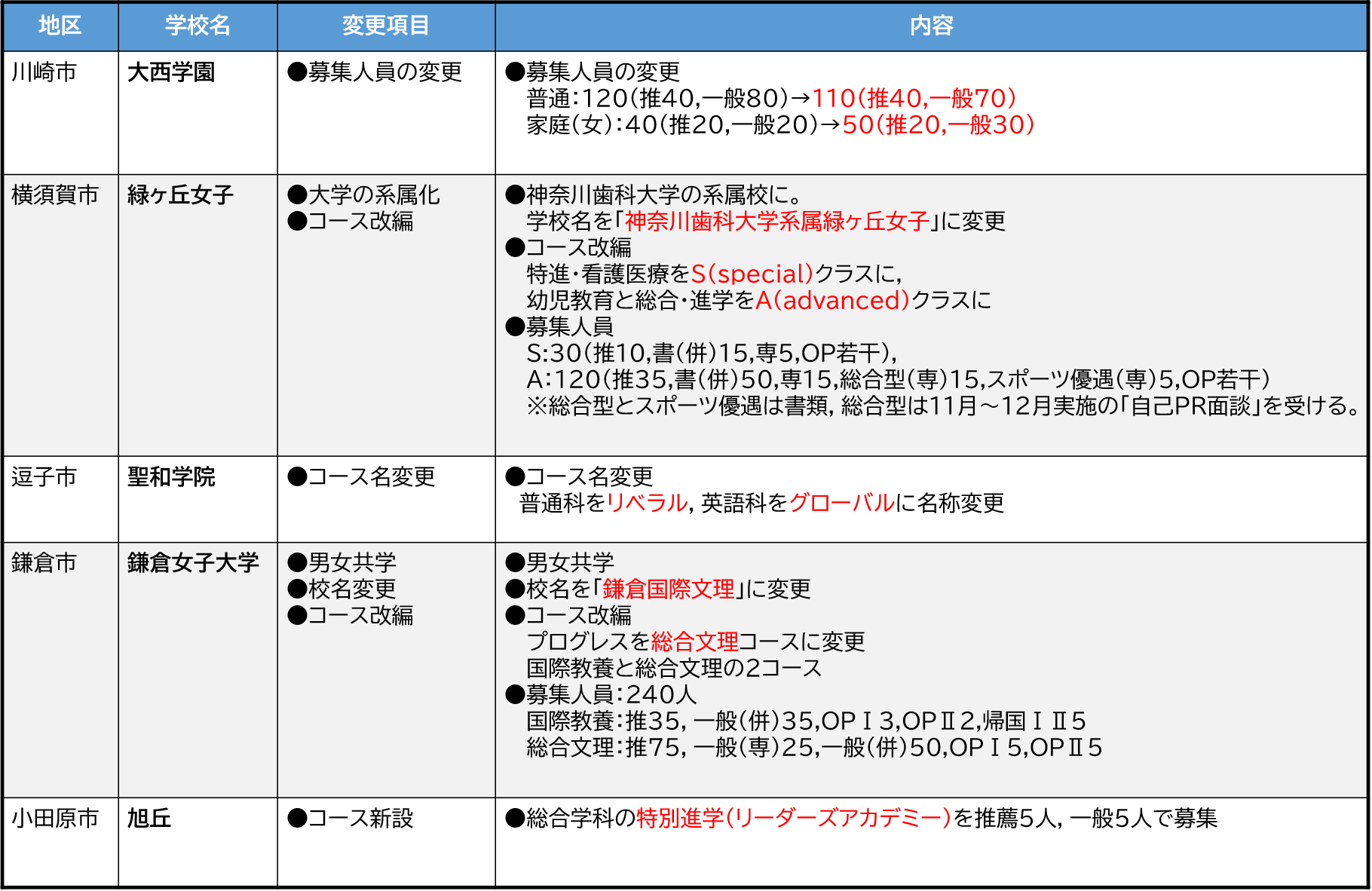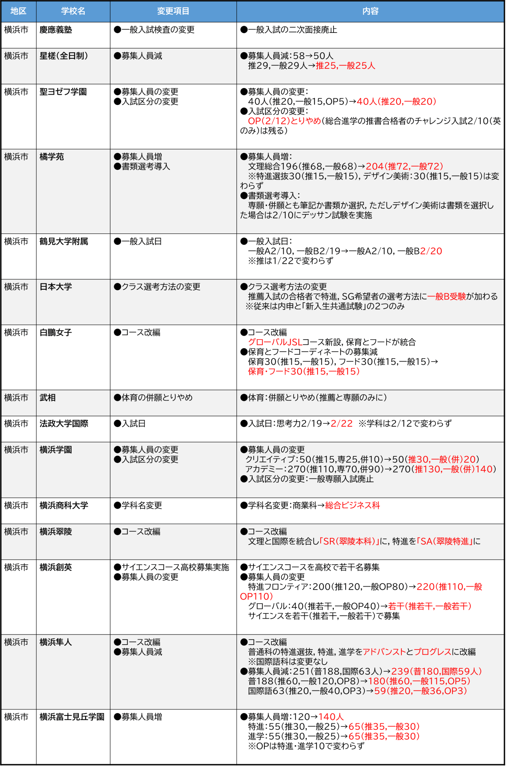神奈川県私立高校のおもな変更点をまとめましたのでご参照ください。なお、各校の募集要項はこちらにアップされています。 令和8年度私立高等学校・中学校・中等教育学校生徒募集及び生徒納付金概要について/神奈川県 ここにある内容も含めて、募集要項については各学校から正式なものを取り寄せるなどして必ずご確認ください。 横浜市 慶應義塾星槎聖ヨゼフ学園橘学苑鶴見大学附属 日本大学白鵬女子武相法政大学国際横浜学園 横浜商科大学横浜翠陵横浜創英横浜隼人横浜富士見丘学園 川崎市・横須賀市・逗子市・鎌倉市・小田原市 大西学園緑ヶ丘女子聖和学院鎌倉女子大学旭丘