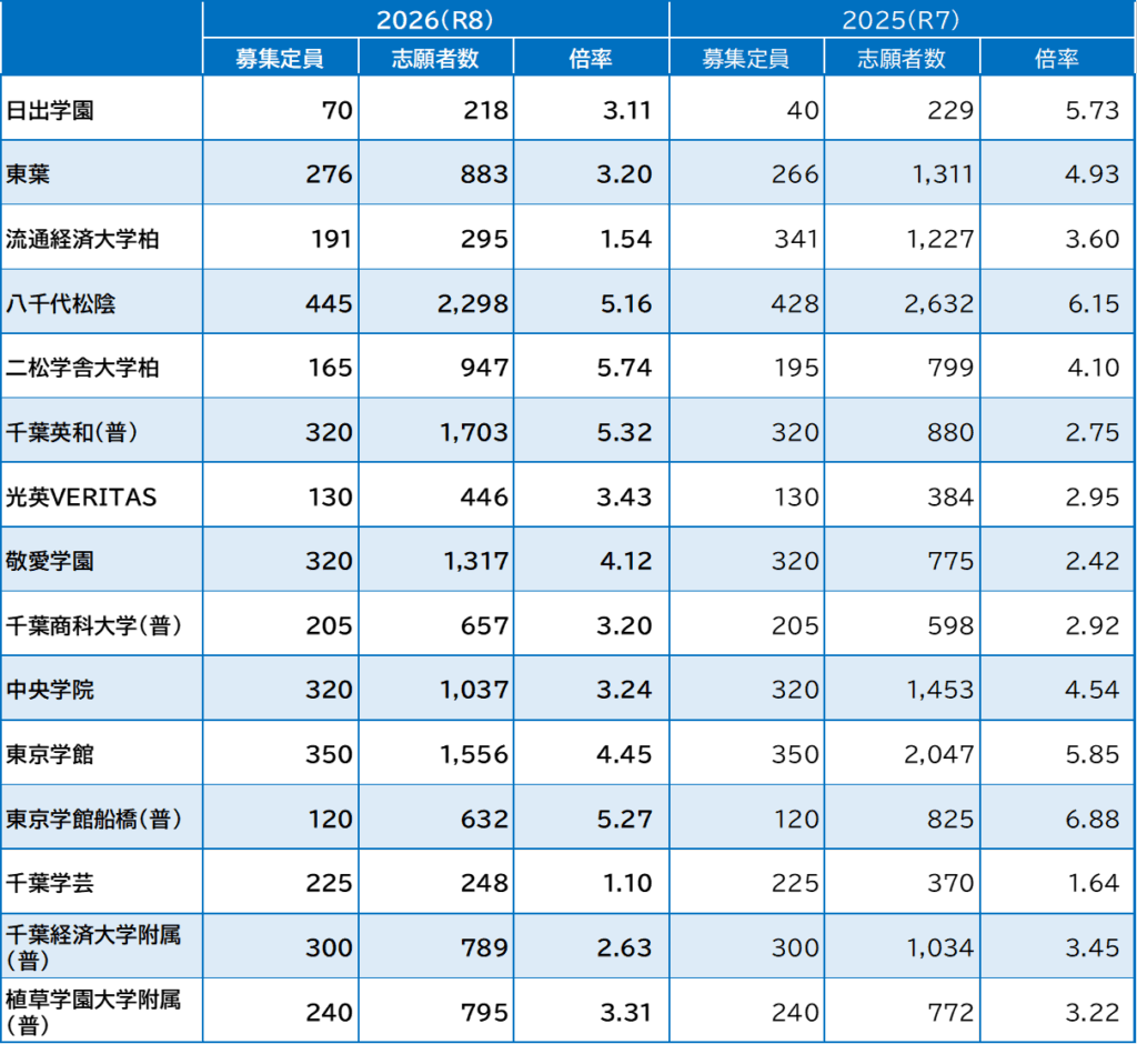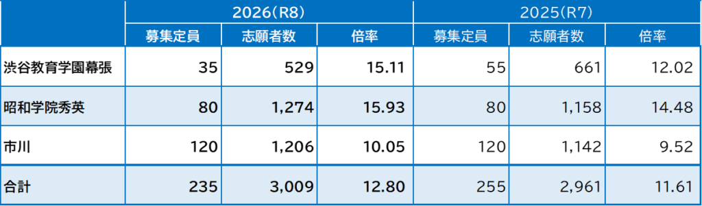 昭和学院秀英の志願者数は,前年度より116人増加して1,274人になり,倍率は15.93倍で前年度より1.45ポイントアップしました。前年度に志願者が減少した反動のほか渋谷教育学園幕張からの流入が考えられます。また,2026(R8)年度入試より,第一志望者に対する加点制度が導入され,同校を第一志望とする受験生が例年以上に集まったようです。
