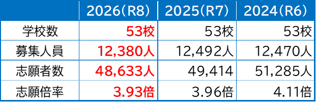 2026(R8)年度の募集校は53校で変わらず,募集人員は前年度に比べ112人減,志願者数は781人減で倍率は0.03ポイント下がり3.93倍になりました。この倍率は過去10年間の最低倍率です。