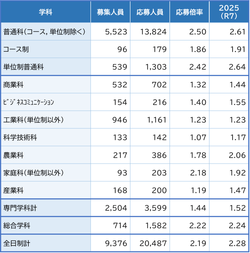 学科別でみると、普通科は2.50倍で前年度より0.11ポイントダウン。コース制、単位制普通科も下がりました。