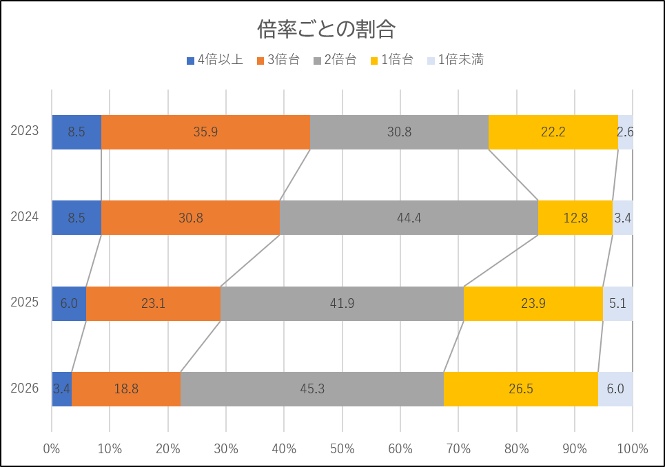 次の表は応募倍率ごとの学校数を割合にし、この4年間を比較したものです。