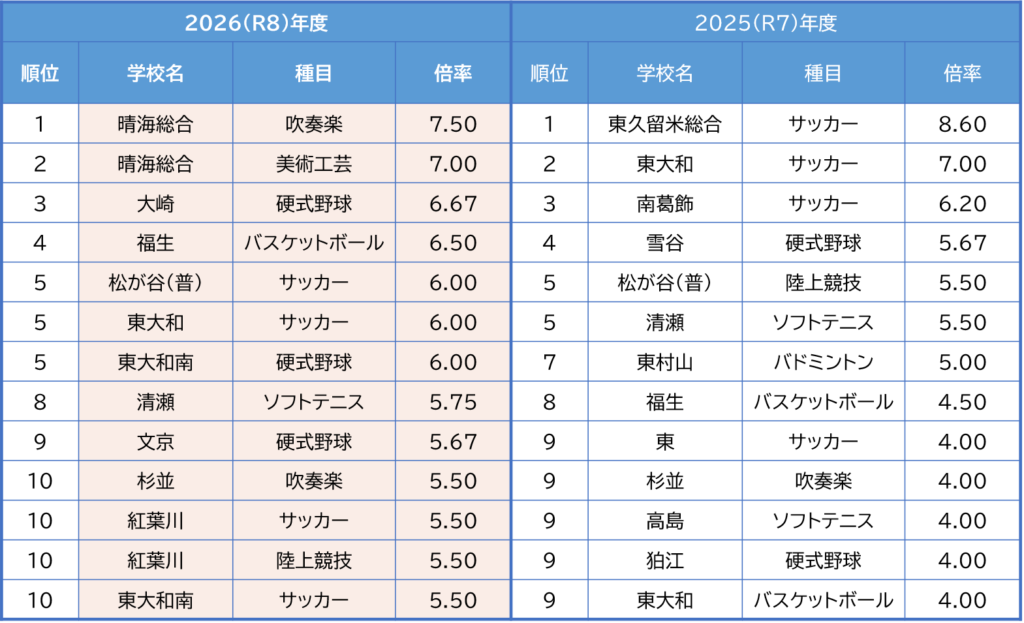 例年のベスト10と異なり、晴海総合の文化系種目が1位と2位になりました。それまでトップに君臨していた東久留米総合「サッカー」は募集人員を5人から10人へと倍増、一方で応募者は43人から38人に減り、倍率は3.80倍とベスト10から外れました。