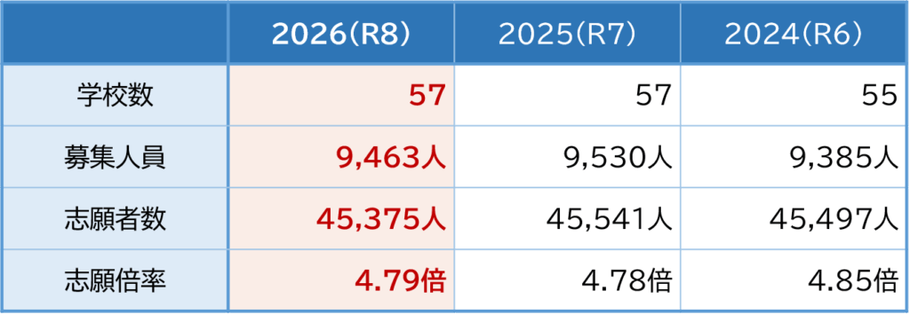 2026(R8)年度の募集校は前年度と変わらず57校です。募集人員は前年度に比べ67人減、志願者数は166人減でした。倍率は4.79倍で前年度とほぼ同じです。