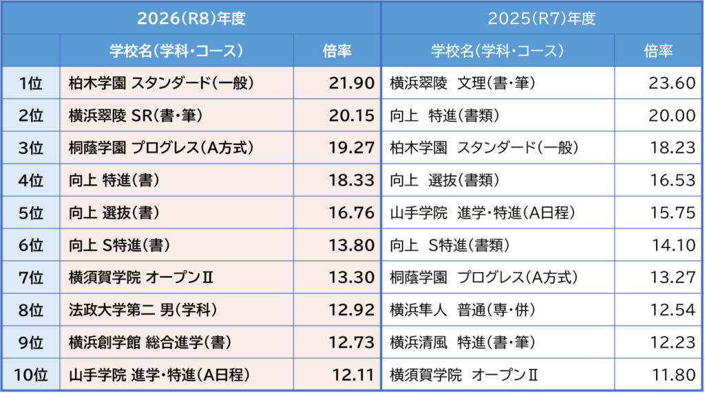 今年度最も高倍率になったのは、例年高倍率になる柏木学園(スタンダード)で、今年度も志願者が増加して倍率がアップしました。一方で、合格のハードルを上げた山手学院は倍率が大きくダウンしています。ほとんど前年度と同じ顔ぶれですが、法政大学第二や横浜創学館がランクインしました。