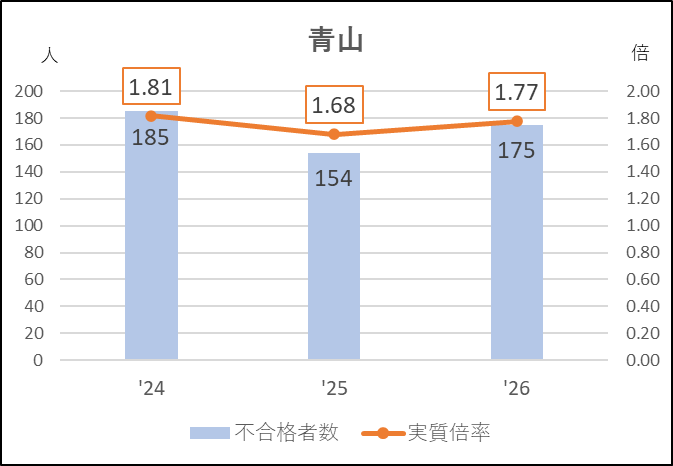 青山は前年度に応募減になり,不合格者もやや減少したことから,今年度は反動が現れ実質倍率は前々年度並みに戻りました。今年度の入試は青山本来の入試状況といえるので私立志向の影響はさほど受けなかったと思われます。