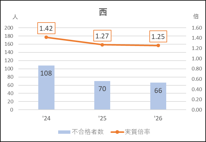 西は2年連続で応募減になり,前年度と同じ緩やかな入試が続きました。不合格者がここまで少なくなったのは近年ではなく,前年度から私立志向の影響を強く受けていると考えられます。私立志向の高い地域にあるため,私立高に流れやすい環境といえます。